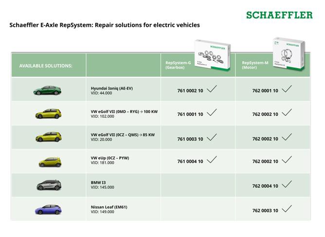 Do natychmiastowego zastosowania dostępne są systemy naprawcze przekładni (E-Axle RepSystem-G) i silnika elektrycznego (E-Axle RepSystem-M) dla następujących modeli pojazdów: Hyundai Ioniq AE-EV, Volkswagen eGolf VII o mocy 100 kW i 85 kW, Volkswagen eUp, BMW I3 oraz Nissan Leaf.